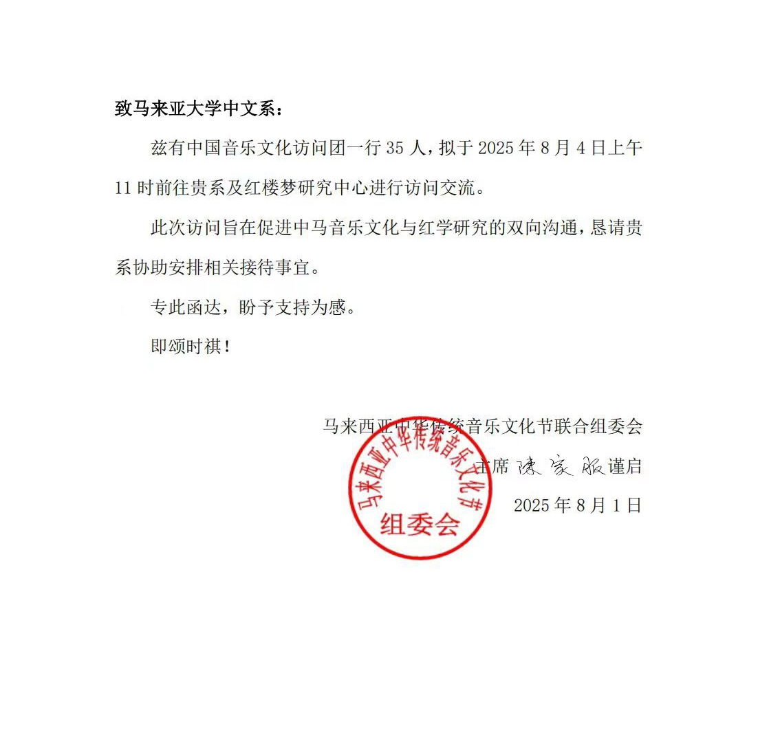 当地时间2025年8月4日上午,由马来西亚中华传统音乐文化节联合组委会主席、中共桂林市委宣传部原副部长、中国华夏文化网总编辑陈家服牵头组织,原中国文化部政策法规司副司长洪永平,中共泉州市委宣传部原副部长、文化局原局长龚万全共同率领的中国音乐文化参访团(一行35人),莅临马来亚大学中文系开展参观访问活动。