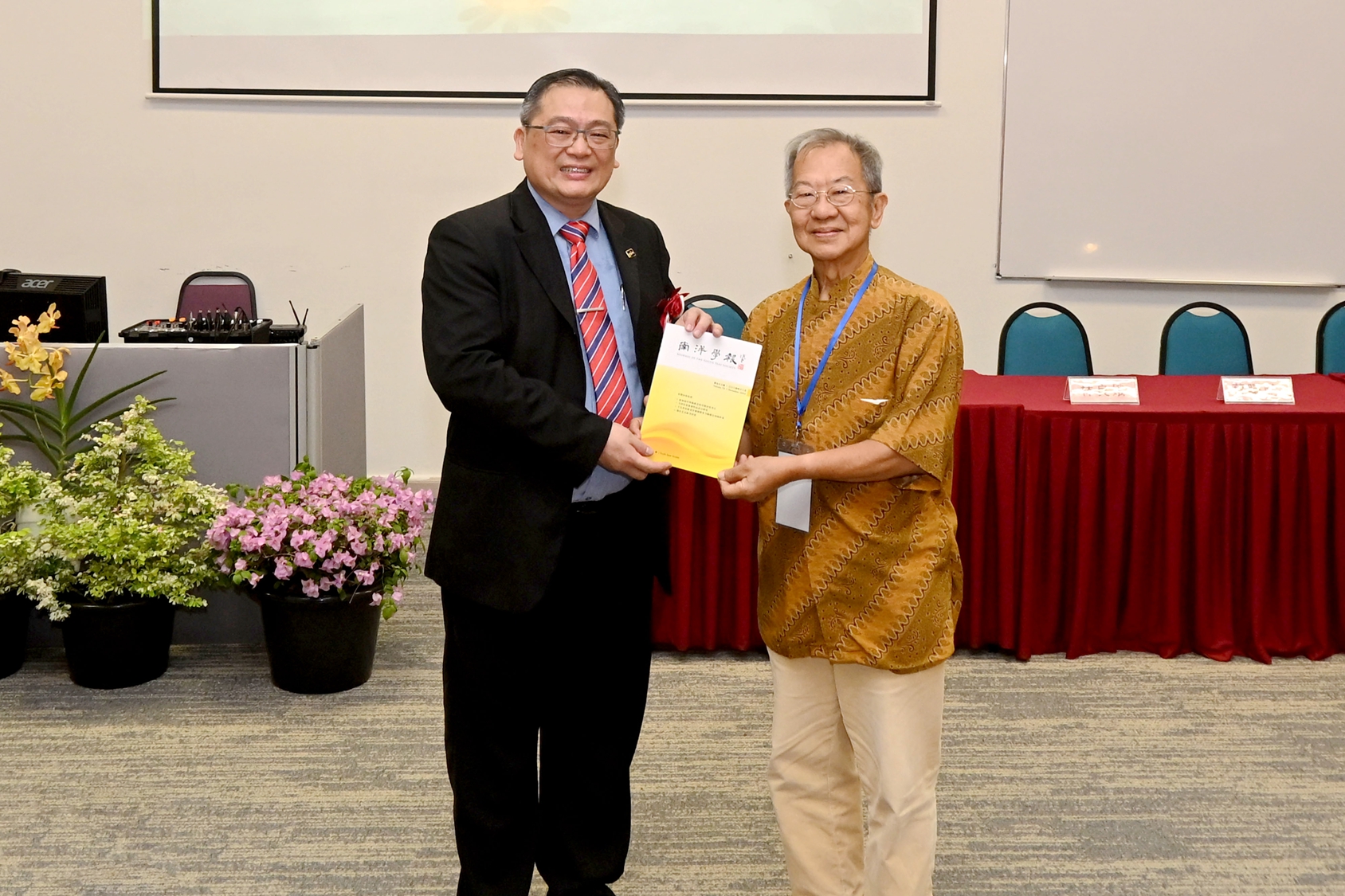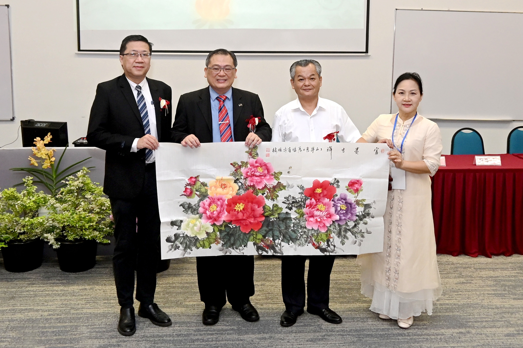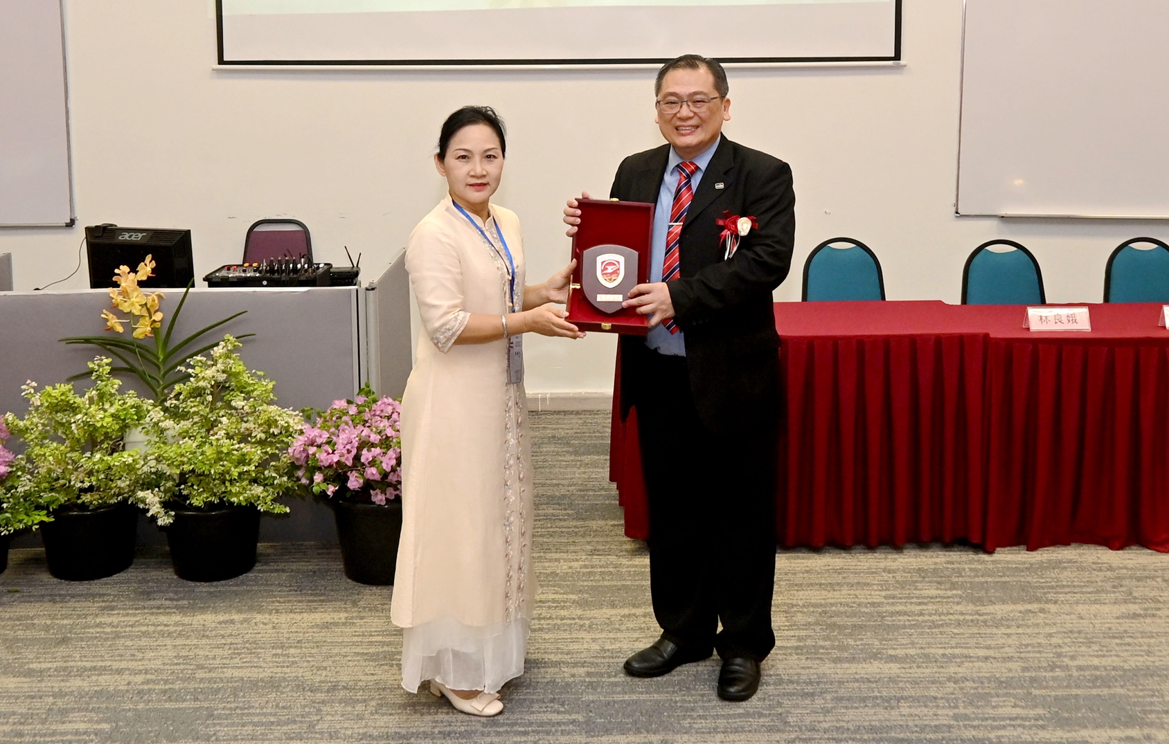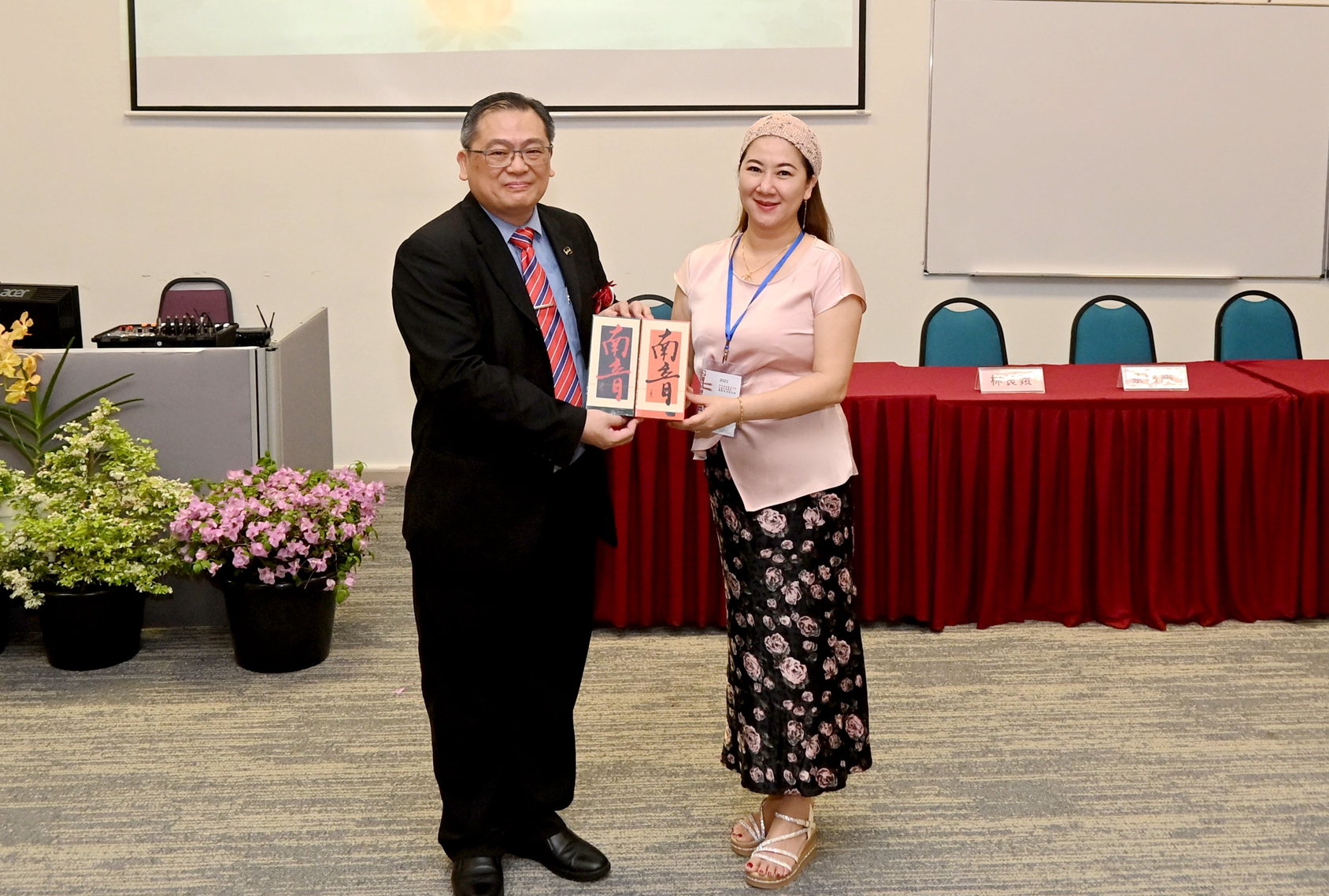 开幕式剪彩仪式后,进入了温馨而又意义非凡的环节——马来西亚拉曼大学中华研究院院长张晓威博士代表主办方与嘉宾互赠纪念品,每一件都饱含着对双方合作的美好期许。