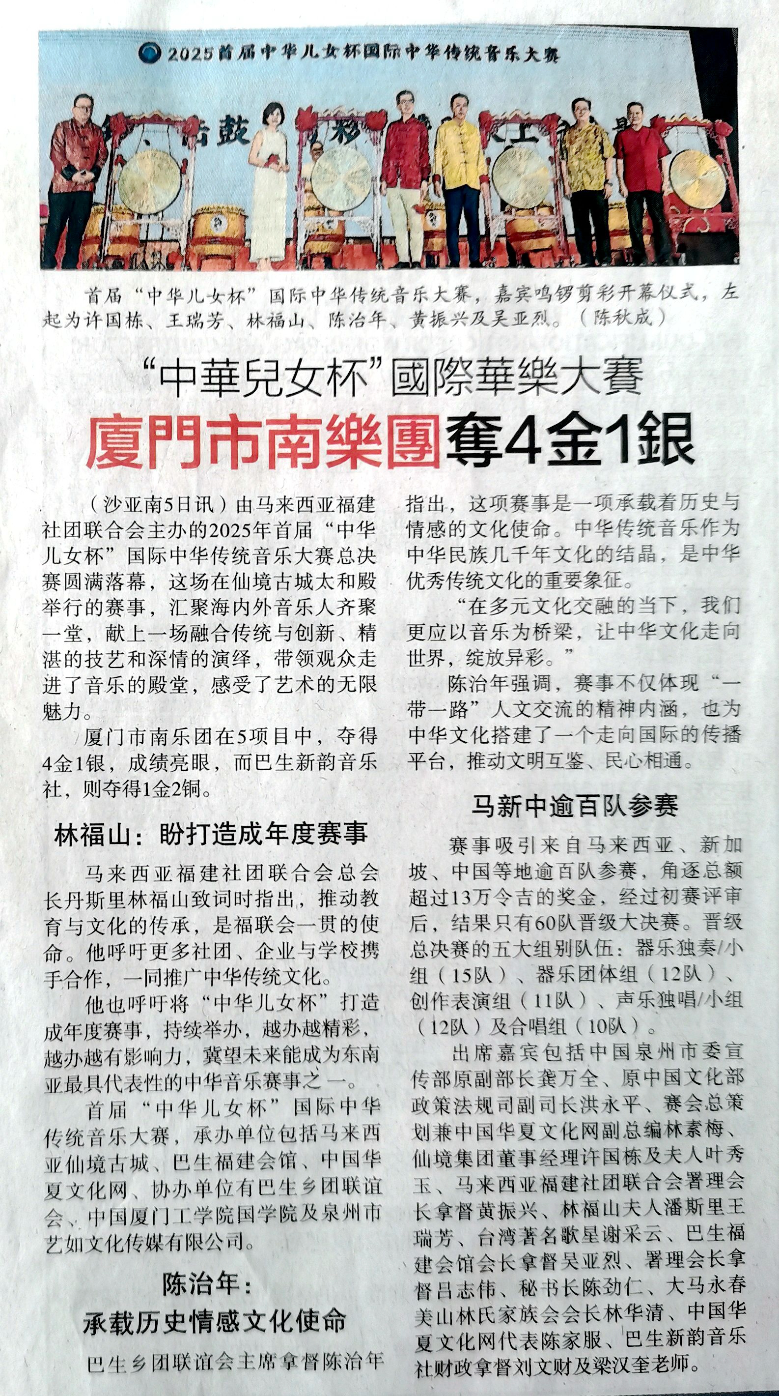 举办国际音乐赛事:在他的牵头组织下,2025首届“中华儿女杯”国际中华传统音乐大赛成功举办。赛事由马来西亚福建社团联合会主办,马来西亚仙境古城、马来西亚巴生福建会馆、中国华夏文化网承办,于2025年8月3日在马来西亚仙境古城落幕,吸引众多海内外音乐人参与。马来西亚福建社团联合会总会长丹斯里林福山更呼吁将赛事打造成年度赛事,助力其成为东南亚最具代表性的中华音乐赛事之一。