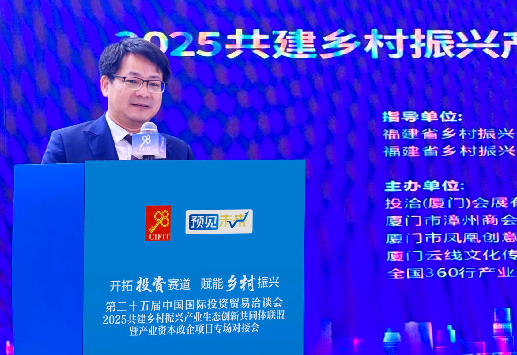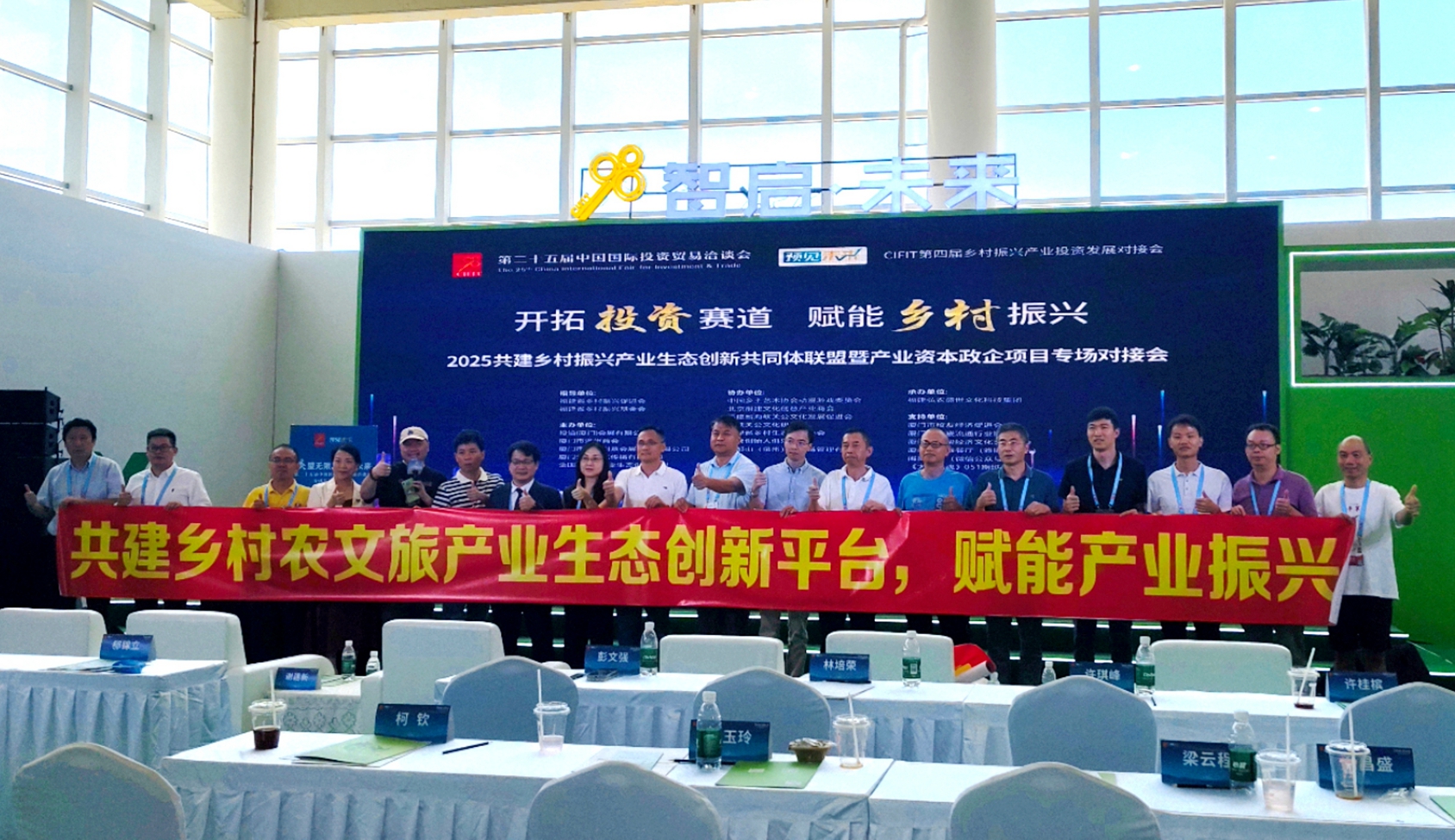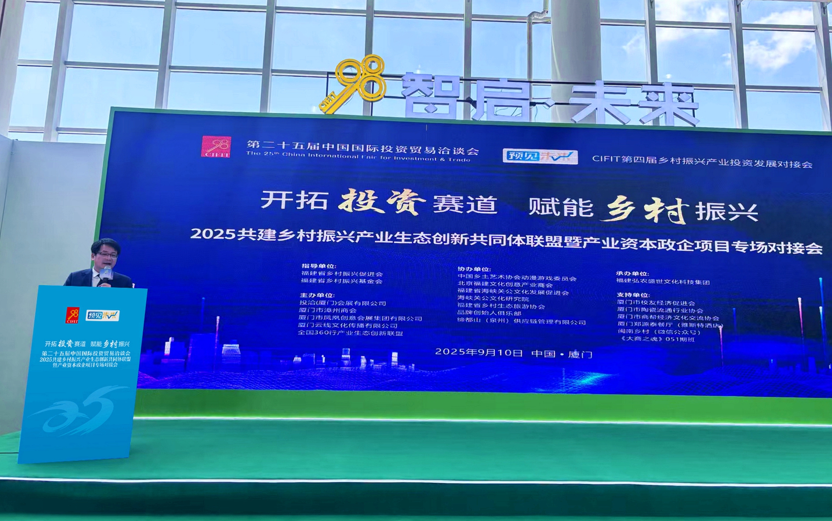 9月10日,2025共建乡村振兴生态产业创新共同体联盟产业资本政企项目对接大会在系第二十五届中国国际投资贸易洽谈会重要活动之一,由指导单位:福建省乡村振兴促进会、福建省乡村振兴基金会;主办单位:投洽(厦门)会展有限公司、厦门市漳州商会、厦门市凤凰创意会展集团有限公司、厦门云线文化传播有限公司、全国360行产业生态创新联盟;协办单位:中国乡土艺术协会动漫游戏委员会、北京福建文化创意产业商会、福建省海峡关公文化发展促进会、海峡关公文化研究院、福建省乡村生态旅游协会、品牌创始人俱乐部、缔都山(泉州)供应链管理有限公司;承办单位:福建弘农盛世文化科技集团;支持单位:厦门市校友经济促进会、厦门市商帮经济文化交流协会、厦门郑源泰餐厅(雅斯特酒店)、闽南乡村(微信公众号)、《大商之魂》051期班、厦门九智品牌策划有限公司。