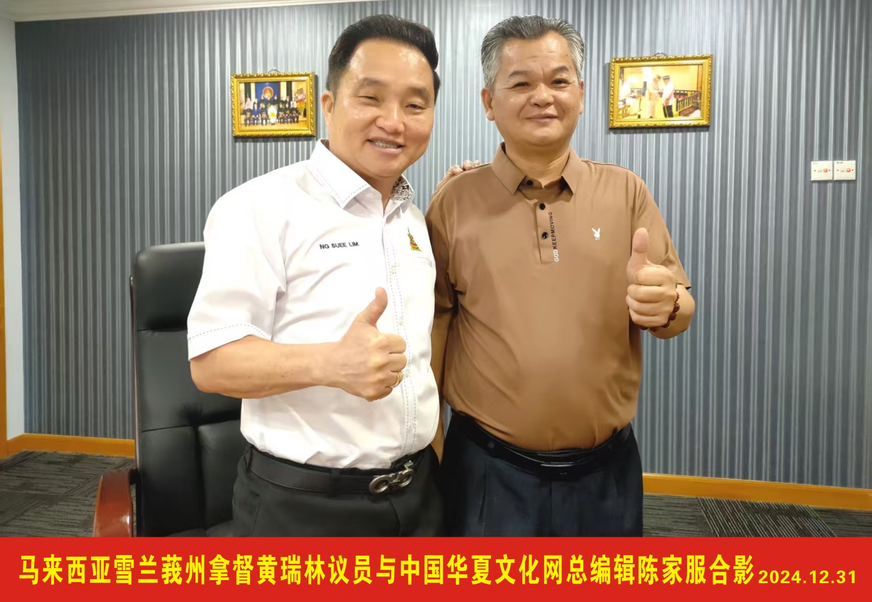 马来西亚雪兰莪州拿督黄瑞林议员(左)与马来西亚中华传统音乐文化节联合组委会主席、中国华夏文化网总编辑、泉州市艺如文化传媒有限公司总经理陈家服(右)合影▲