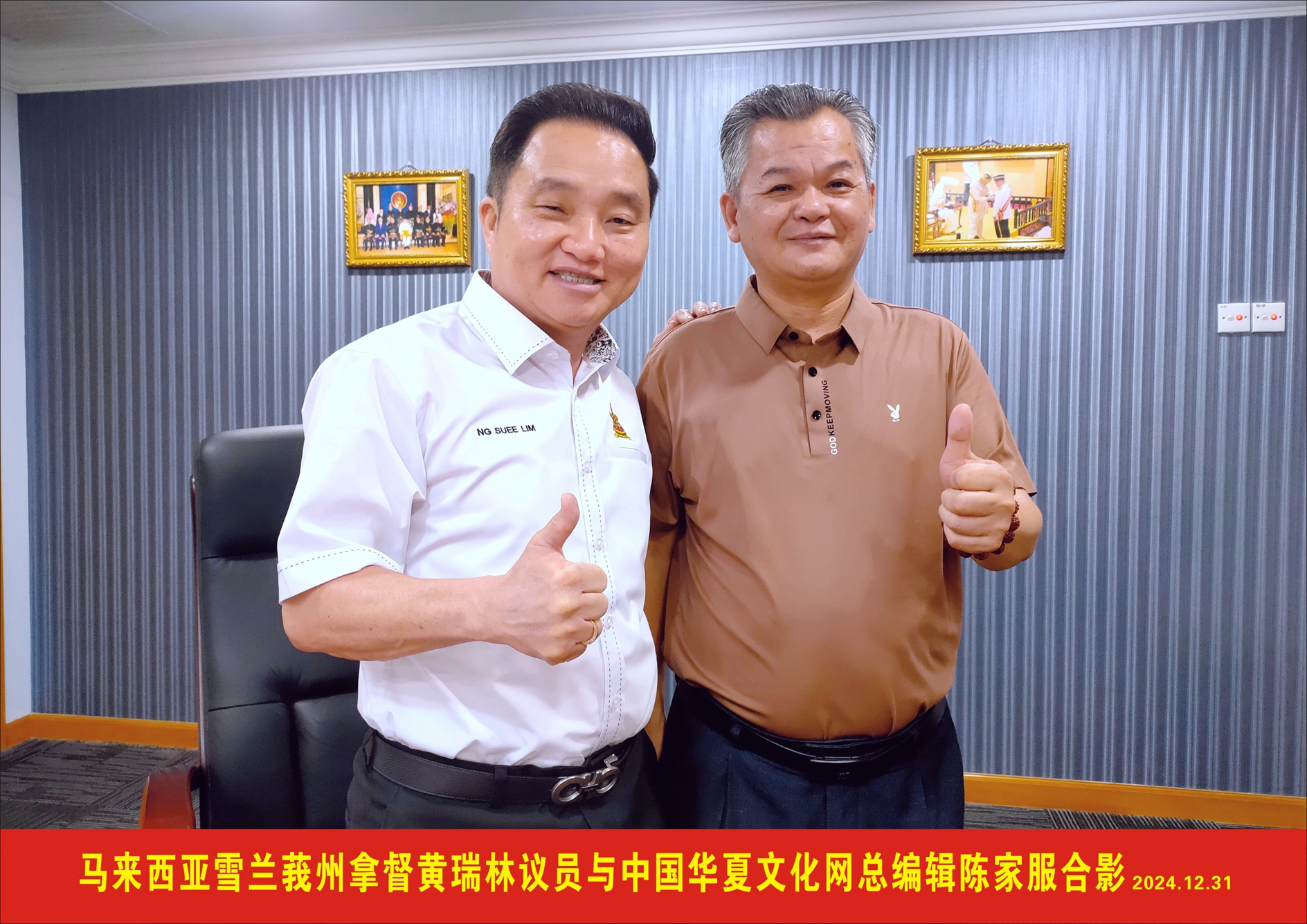 馬來西亞雪蘭莪州拿督黃瑞林議員(左)與中國華夏文化網總編輯、香港華夏文化藝術出版社社長兼總編輯、馬來西亞中華傳統音樂文化節聯合組委會主席陳家服(右)合影▲