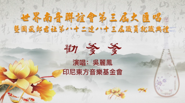 世界南音联谊会第三届大会唱暨菲律宾国风郎君社第八十二连八十三届职员就职典礼——参演曲目:南音《劝爹爹》演出单位:印尼东方音乐基金会