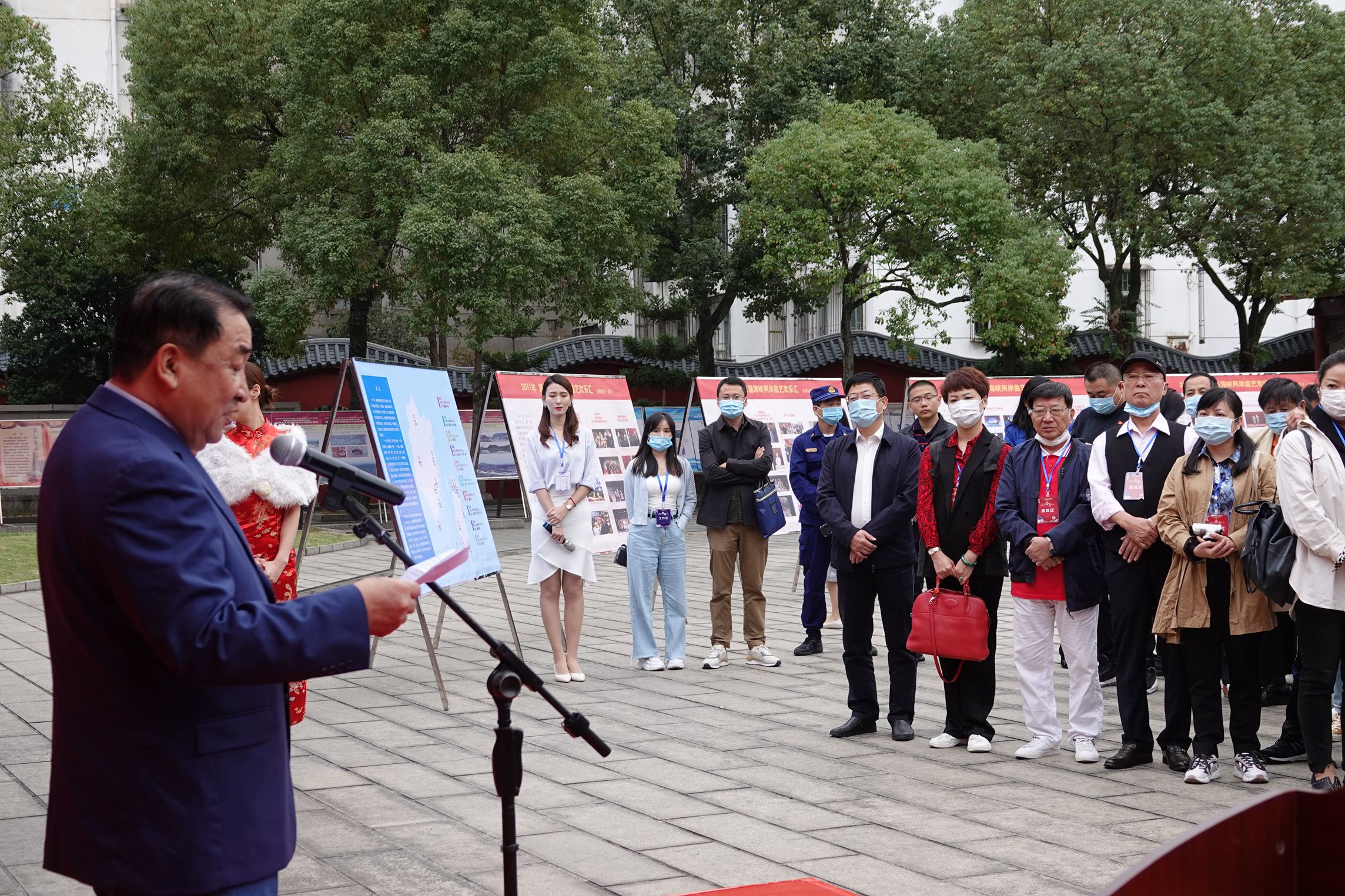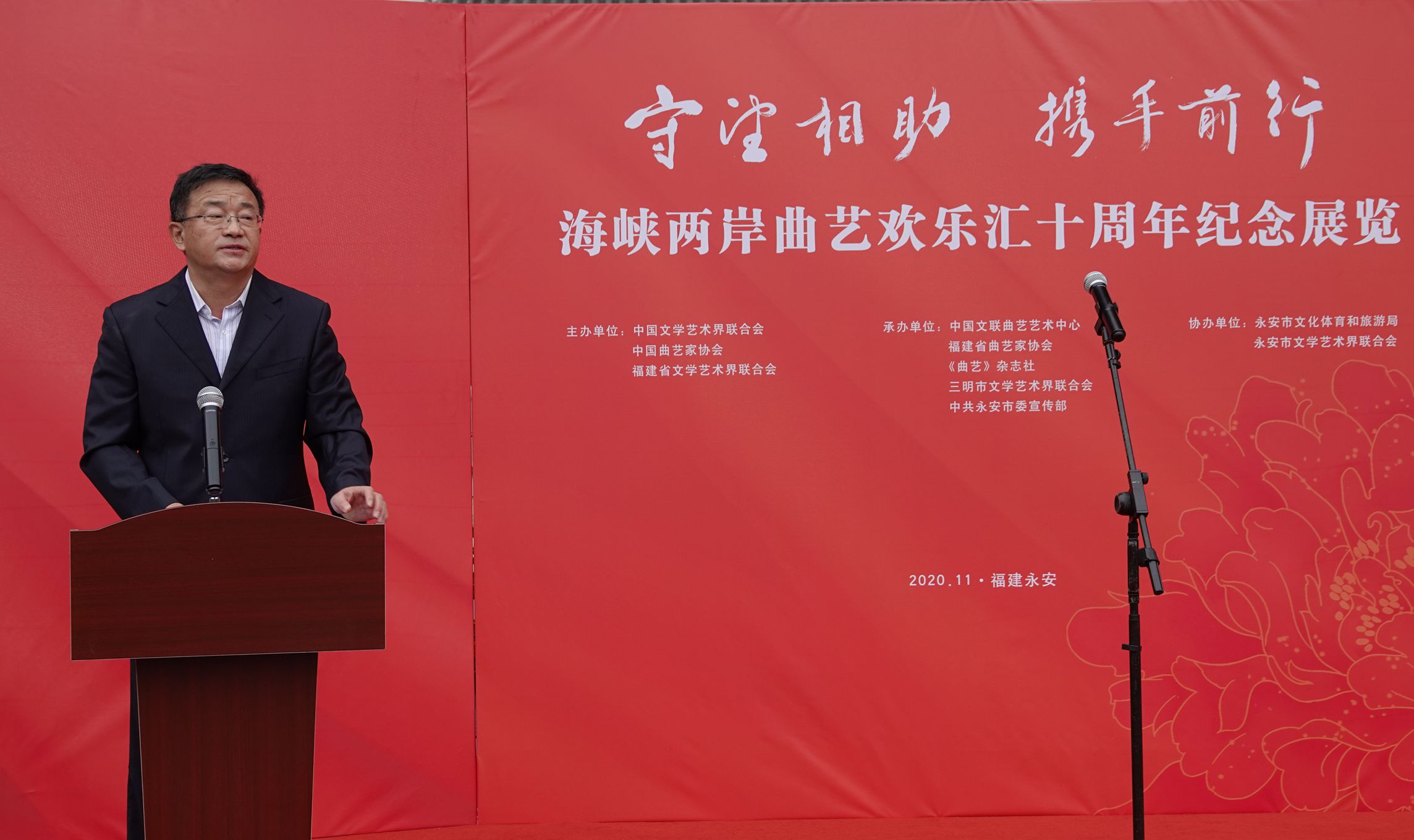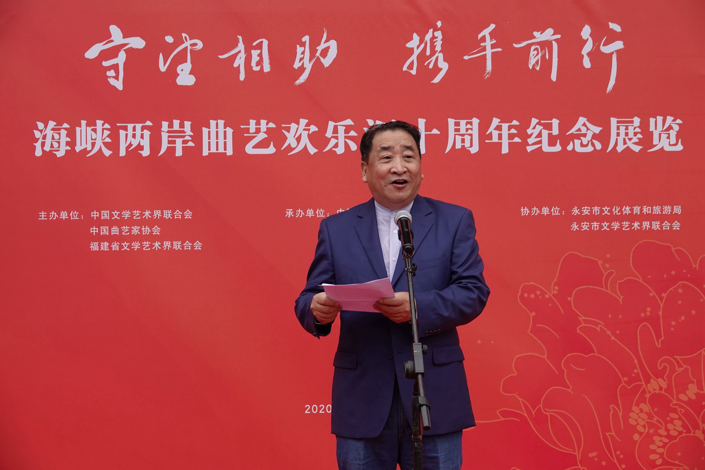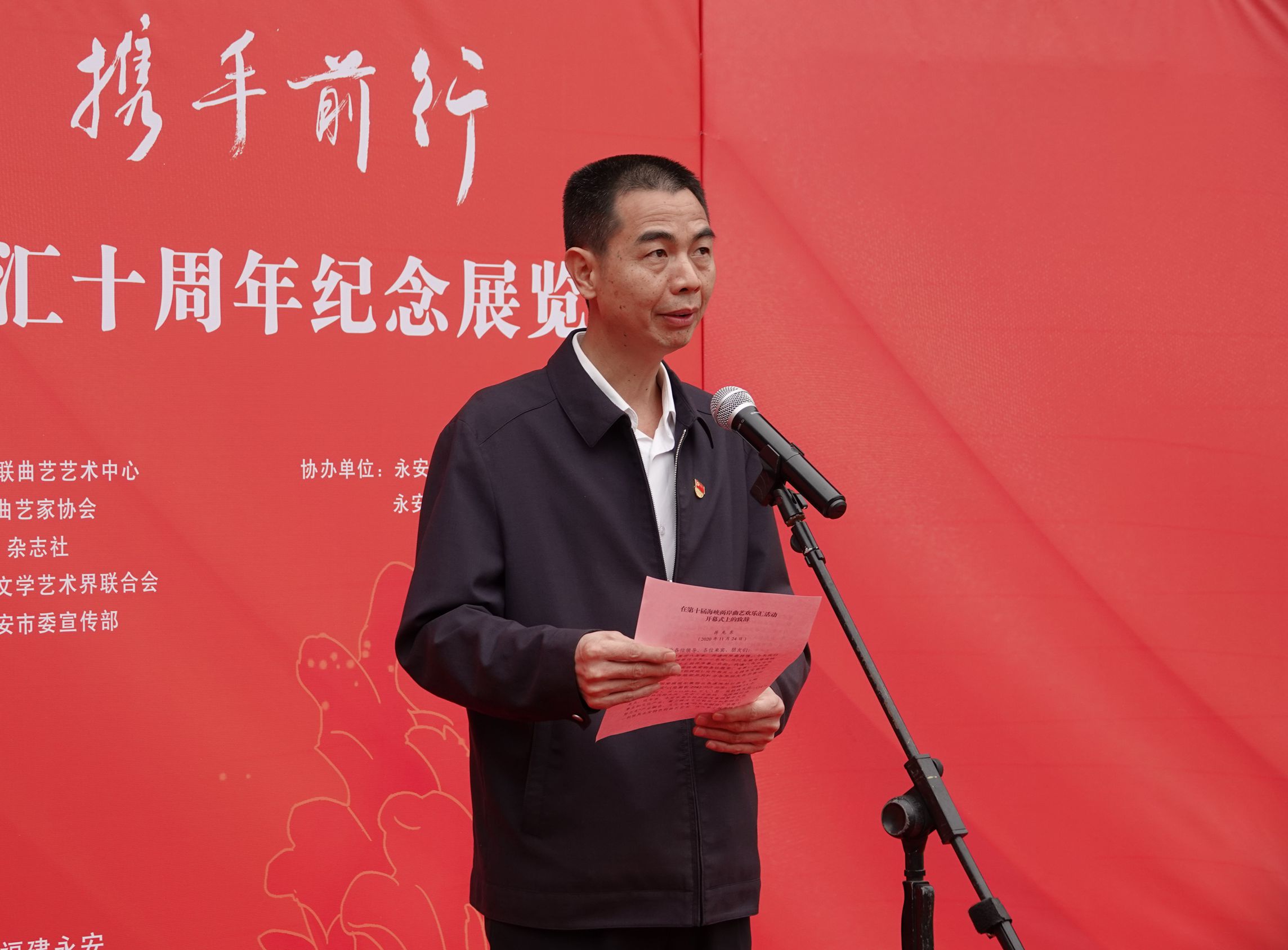 中国曲协分党组副书记、秘书长曲华江主持“守望相助 携手前行——海峡两岸曲艺欢乐汇十周年纪念展览”开幕式▲