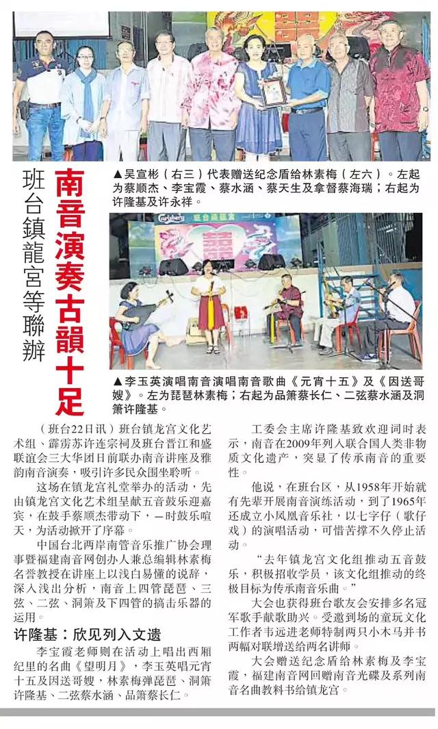 新闻背景:伴随着中国步入世界政治舞台的中心,中国文化“走出去”的步伐也愈发稳健。在中国台湾,有一位爱国台胞、资深南音艺术家,她就是中国华夏文化网艺术总监、中国台北市两岸南管音乐推广协会理事长、福建南音网总编辑林素梅(先生),也带着她的南音专业小团队,不畏辛劳走出国门,开赴马来西亚(班台、太平……等地区)进行为期两周的南音巡回交流讲座与推广。(陈家服 李宝霞/文 图 视频报道)